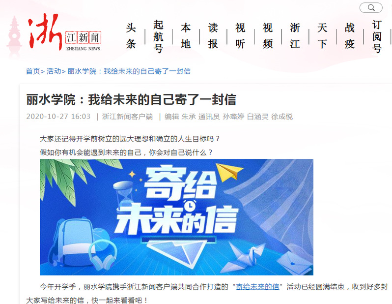 2020年10月27日,浙江新闻报道了我校开展“我给未来的自己寄了一封信”的活动。