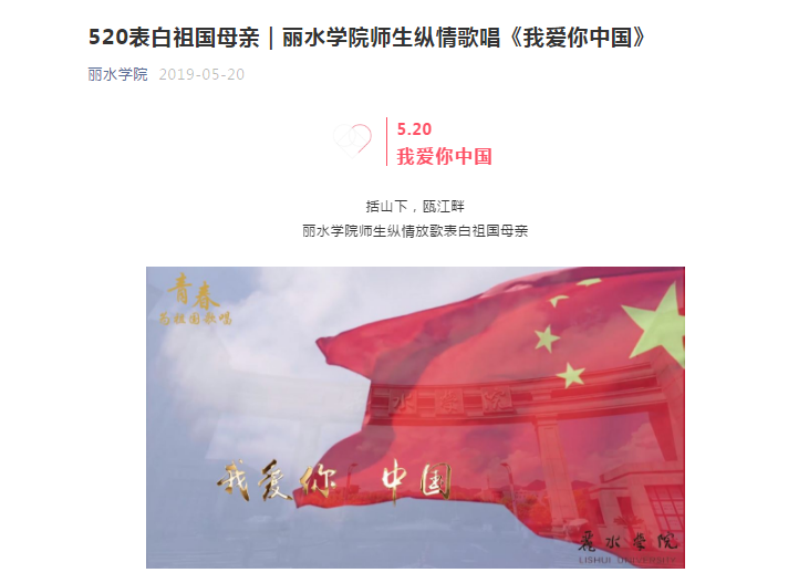 按照浙江省优秀教育新媒体评选活动的相关要求,日前,省记协教育新闻工作者委员会与省教育厅新闻办公室公布2019年度浙江省优秀教育新媒体及先进工作者。我校作品《520表白祖国母亲丨丽水学院师生纵情歌唱<我爱你中国>》获新媒体创新奖,陈池获先进工作者。