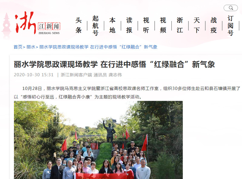 2020年10月30日,浙江新闻报道了我校马克思主义学院暨浙江省高校思政课名师工作室,组织30多位师生赴云和县石塘镇开展了以“感悟初心行至远,红绿融合奔小康”为主题的现场教学活动的消息。