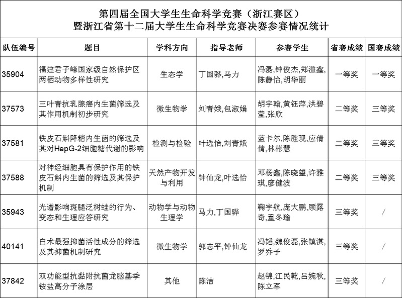 该竞赛由浙江省大学生科技竞赛委员会主办,为省A类学科竞赛。比赛旨在培养大学生的创新意识、团队精神和实践能力,拓宽科学视野,增强社会责任感,促进生命科学学科教学改革,提高人才培养质量。一直以来,生态学院生态与生物资源系对生命科学竞赛十分重视,将其作为人才培养的重要环节来抓,鼓励广大学生积极参加。