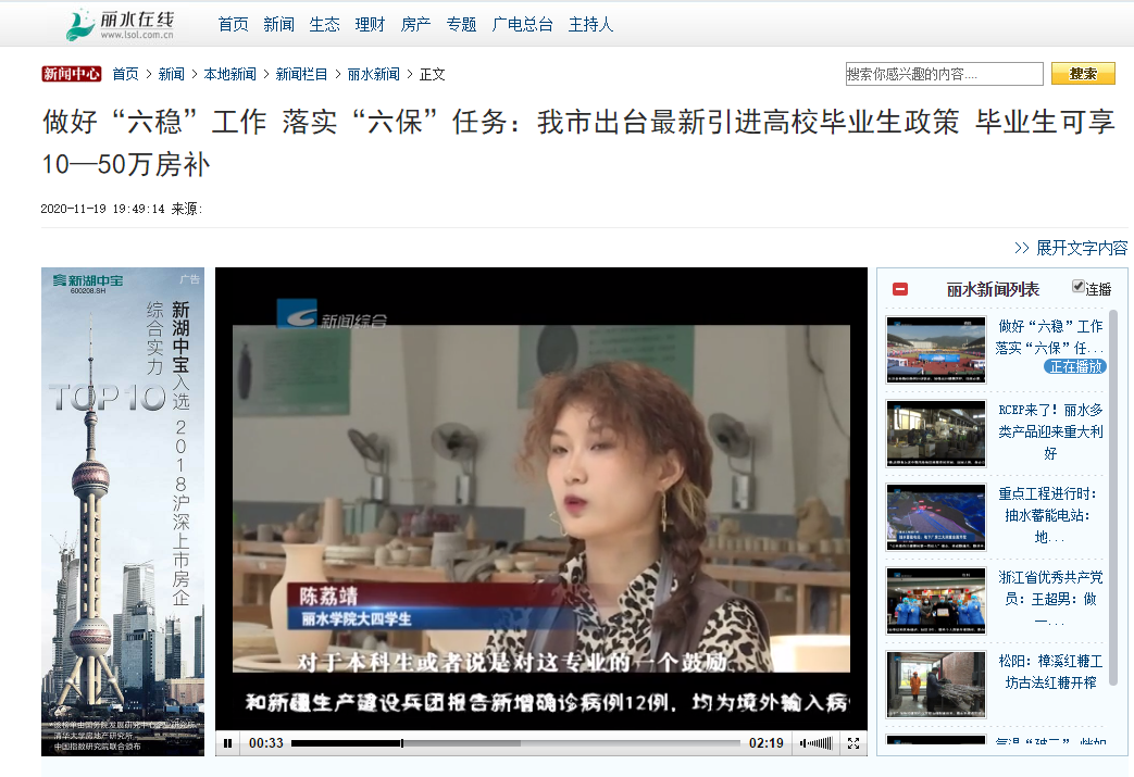 2020年11月19日,丽水电视台新闻综合栏目报道了做好“六稳”工作 落实“六保”任务:我市出台最新引进高校毕业生政策 毕业生可享10—50万房补,我校三名学生接受采访。