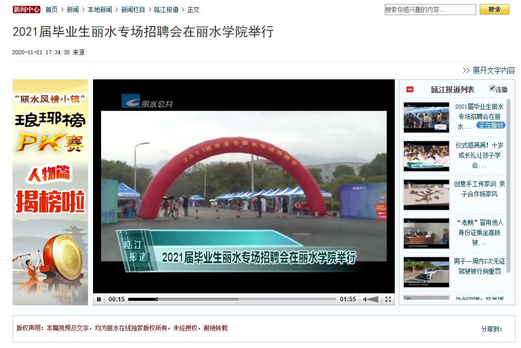 11月21日,丽水电视台丽水公共频道报道了在我校举行的2021届毕业生丽水专场招聘会的消息。