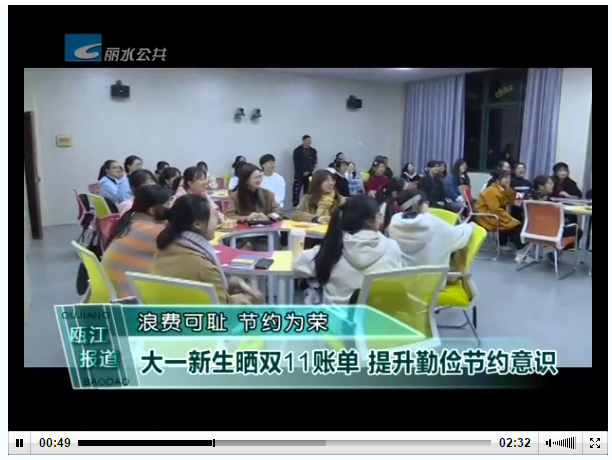 2020年12月1日,丽水电视台公共频道《瓯江报道》栏目报道了我校学生晒双十一账单,提升勤俭节约意识的消息。