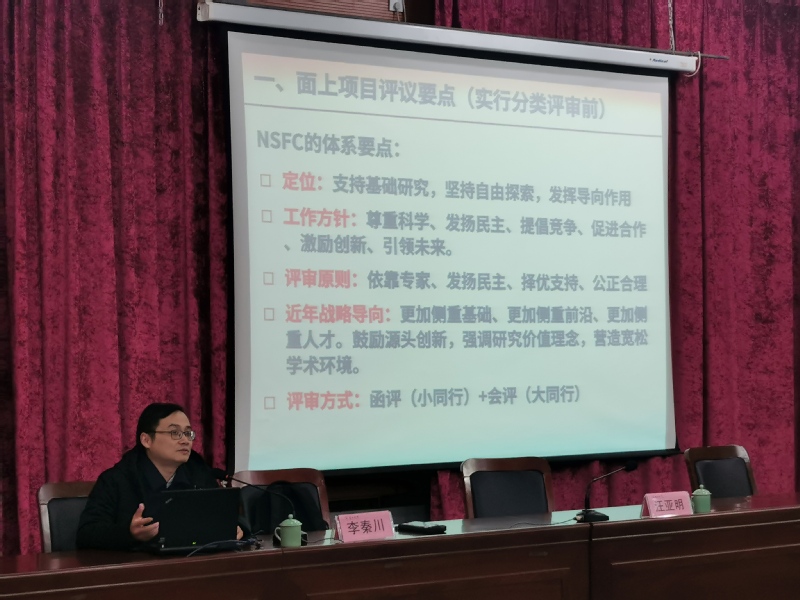 会上,李秦川围绕基金申请书的撰写若干问题进行了深入浅出的阐述。“鼓励探索,突出原创……聚焦前沿,独辟蹊径……需求牵引,突破瓶颈……共性导向,交叉融合……自我查重,避免范低级错误,提高本子质量。”针对申请书的各部分内容,他逐条阐述如何写出一份没有瑕疵的申请书。