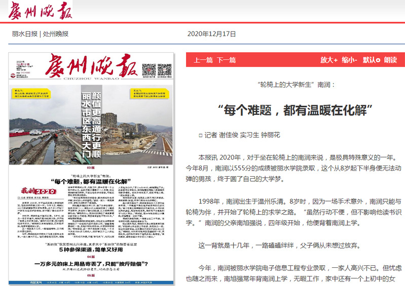 2020年12月17日,处州晚报头版报道了我校“轮椅上的大学新生”南润的相关事迹。
