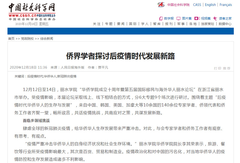 2020年12月18日,中国社会科学网报道了我校举办“华侨学院成立十周年暨第五届国际移民与海外华人丽水论坛”的消息。