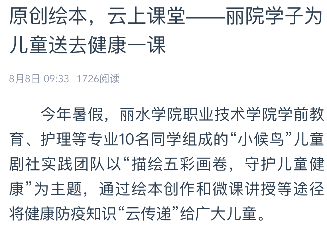 2020年8月8日,指尖丽水报道了职业技术学院学前教育、护理等专业十名学生组成的“小候鸟”儿童剧社实践团队通过绘本创作和微课讲授等途径将健康防疫知识“云传递”给广大儿童的消息。