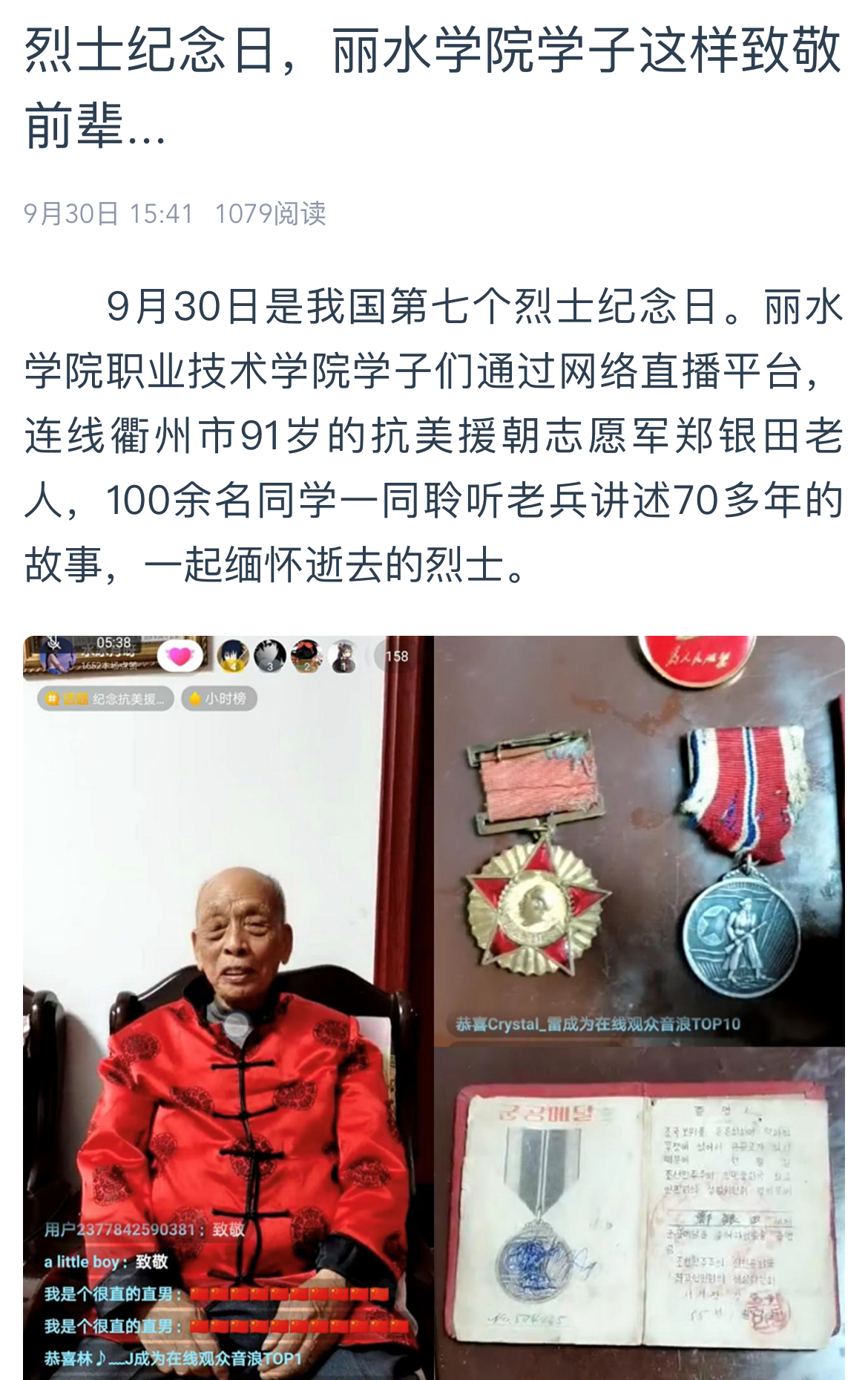 2020年9月30日,指尖丽水报道了我校职业技术学院学子们通过网络直播平台,连接衢州抗美援朝志愿军郑银田老人的消息。