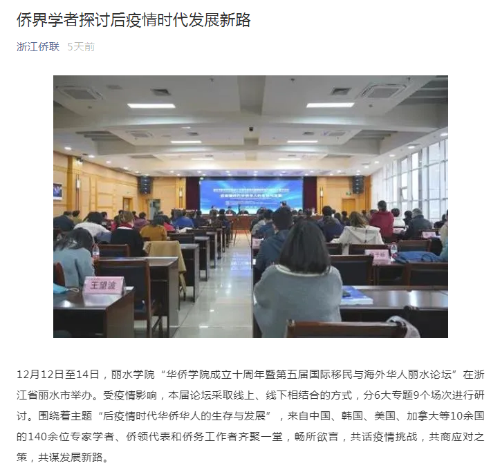 2020年12月16日,浙江省侨联微信公众号报道了我校举办“华侨学院成立十周年暨第五届国际移民与海外华人丽水论坛”的消息。