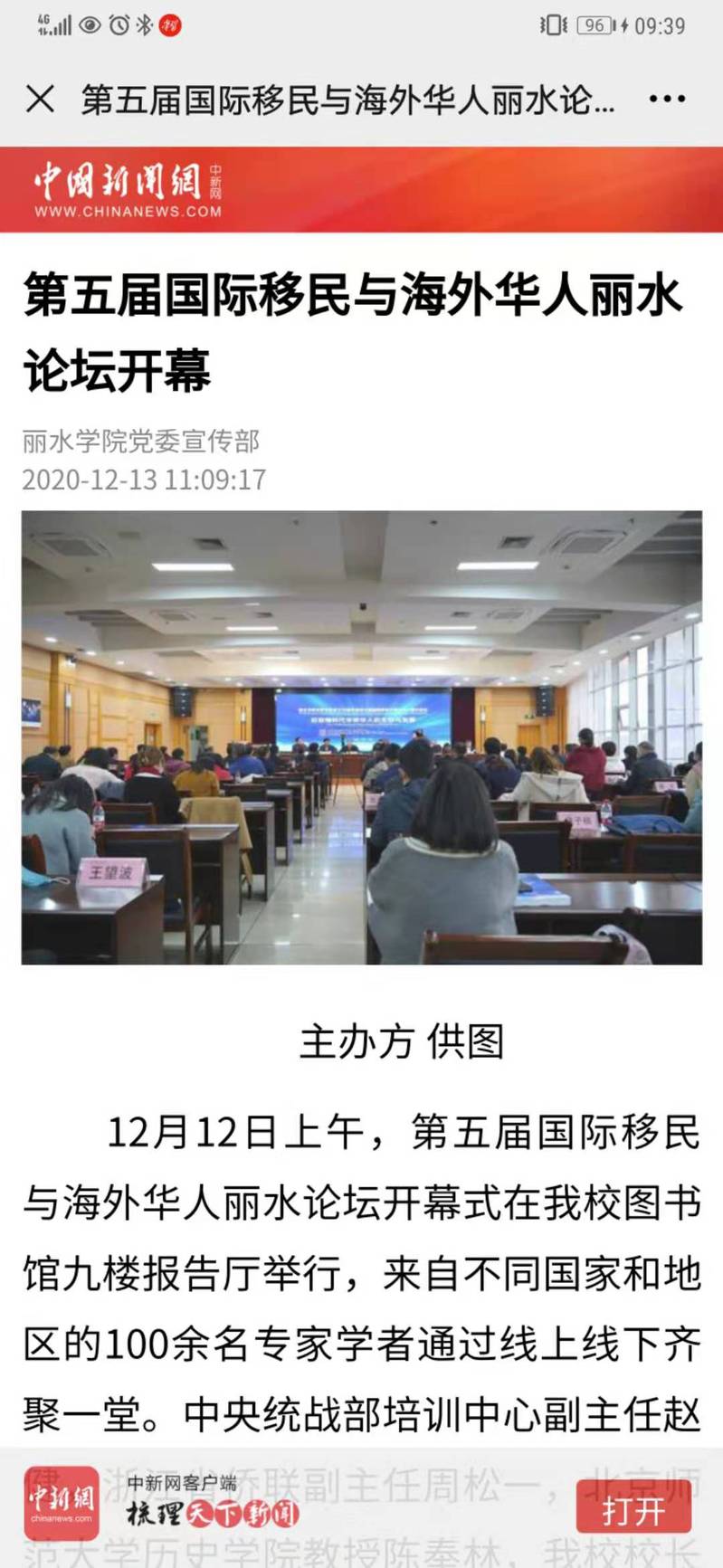 2020年12月13日,中国新闻网报道了我校举办“华侨学院成立十周年暨第五届国际移民与海外华人丽水论坛”的消息。