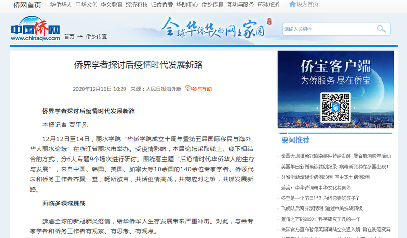 2020年12月16日,中国侨网报道了我校举办“华侨学院成立十周年暨第五届国际移民与海外华人丽水论坛”的消息。