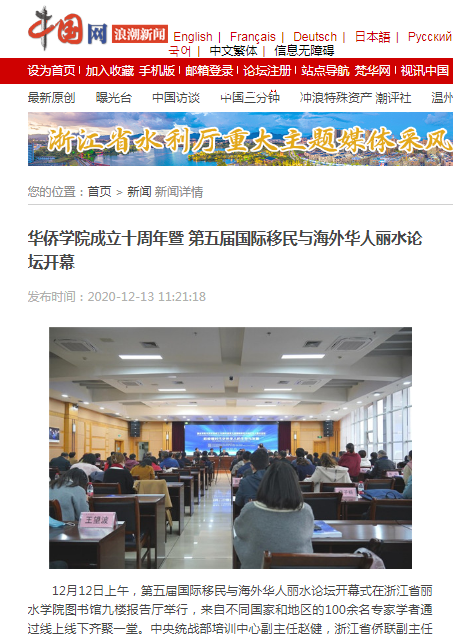 2020年12月18日,中国网报道了我校举办“华侨学院成立十周年暨第五届国际移民与海外华人丽水论坛”的消息。