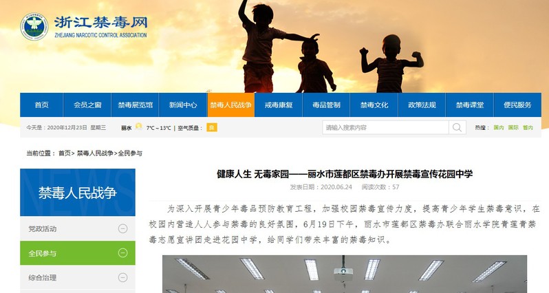 2020年6月24日,浙江禁毒网报道了我校青莲青禁毒志愿宣讲团走进花园中学的消息。