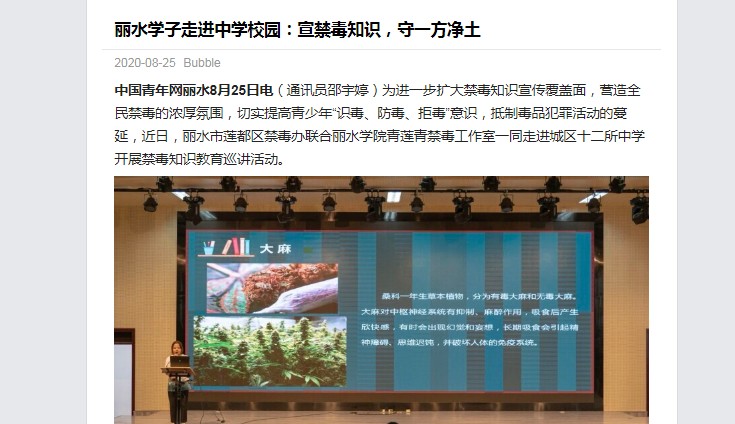 2020年8月25日,中国青年网报道了我校青莲青禁毒工作室一同走进城区十二所中学开展禁毒知识教育巡讲活动的消息。
