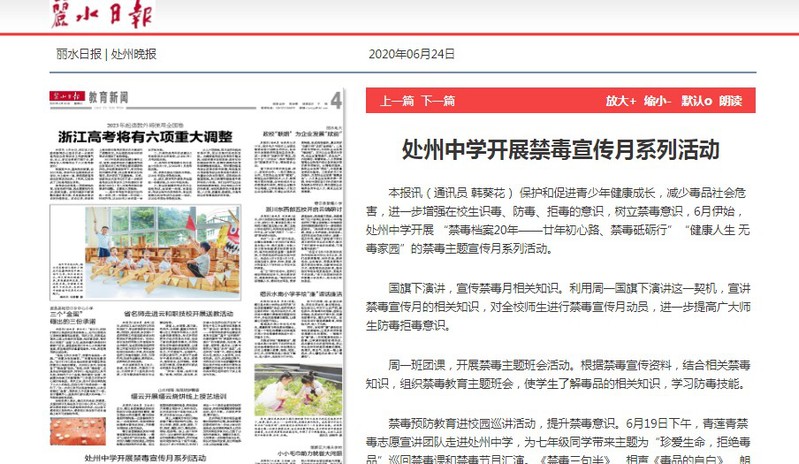 2020年6月24日,处州晚报报道了我校青莲青禁毒志愿宣讲团队走进处州中学开展禁毒预防教育进校园巡讲活动的消息。