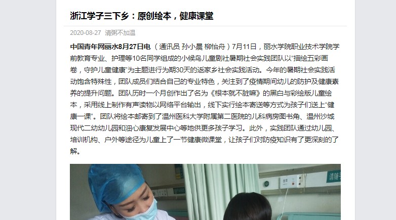 2020年8月27日,中国青年网报道了我校职业技术学院学前教育专业、护理等10名同学组成的小候鸟儿童剧社暑期社会实践团队以“描绘五彩画卷,守护儿童健康”为主题进行为期30天的返家乡社会实践活动的消息。