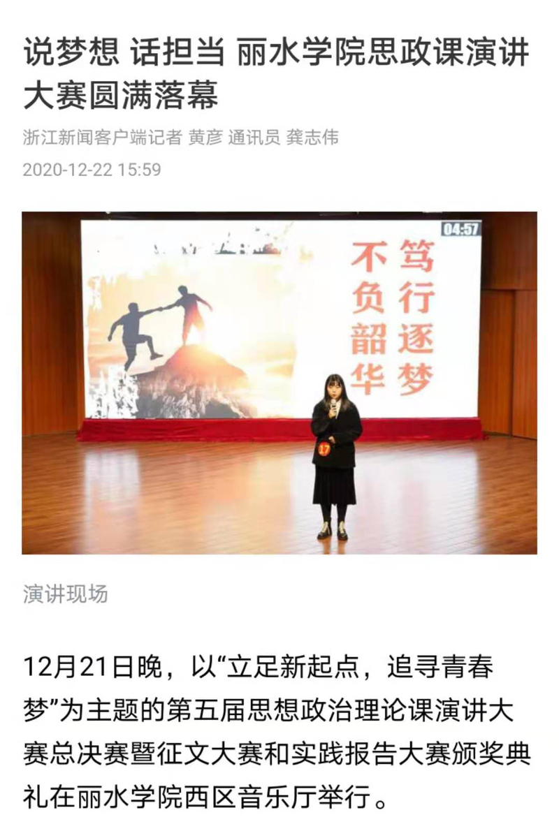 2020年12月22日,浙江新闻发布了我校第五届思想政治理论课演讲大赛总决赛的相关消息。