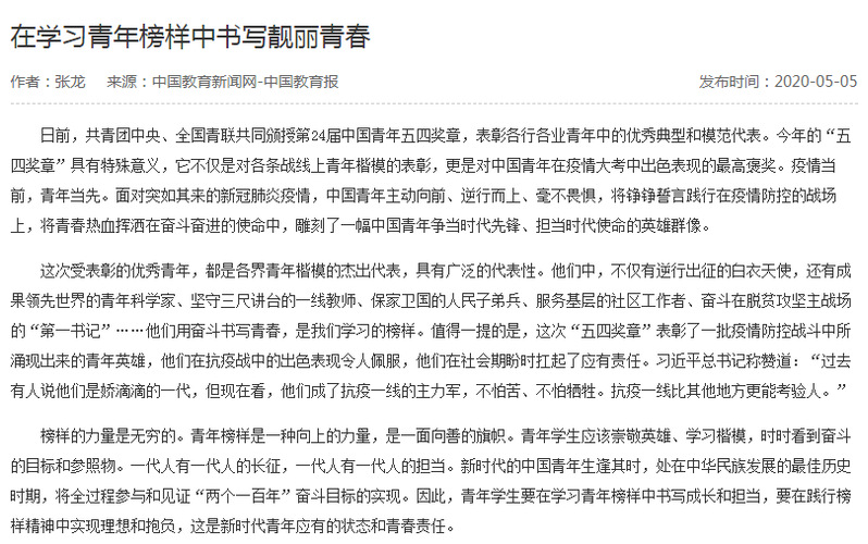 2020年5月5日发行的《中国教育报》第2版刊发了我校继续教育学院教师张龙的评论《在学习青年榜样中书写靓丽青春》。