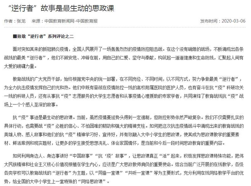2020年3月6日发行的《中国教育报》第2版刊发了我校继续教育学院教师张龙的评论《“逆行者”故事是最生动的思政课》。