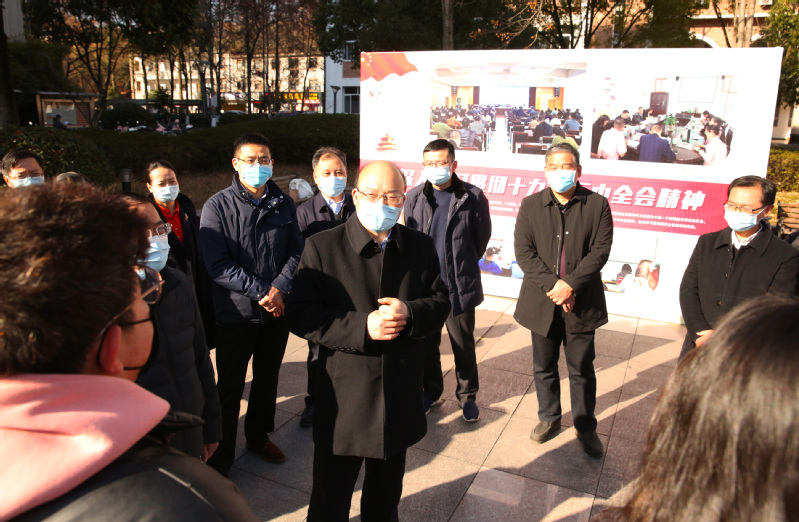 在图书馆前广场,尹学群向到场师生进行了党的十九届五中全会精神的宣讲。他指出,党的十九届五中全会是我们党在两个一百年历史交汇点上召开的一次十分重要的会议,是在我国将进入新发展阶段、实现中华民族伟大复兴正处于关键时期召开的一次具有全局性、历史性意义的会议。他鼓励大家深入学习贯彻党的十九届五中全会精神,深刻领会精神实质,精准把握核心要义,在全面建设社会主义现代化国家新征程中贡献丽院学子的力量。