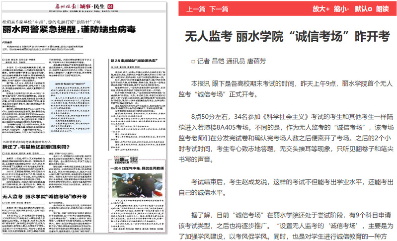 2021年1月20日出版的《处州晚报》报道了我校开设诚信考场的消息。