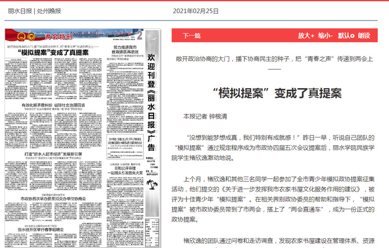 2021年2月25日发行丽水日报二版头条报道了我校学生参与市政协模拟提案的消息。