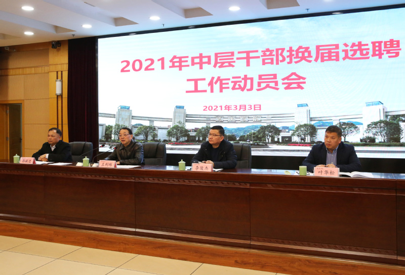 3月3日下午,学校在图书馆9楼报告厅召开2021年中层干部换届选聘工作动员会,校党委书记王利琳出席并讲话,校长李俊杰,党委副书记叶华松,党委委员、组织部部长余德华,党委委员、民族学院党委书记、院长王赳,党委委员、宣传部部长廖峰出席,党委副书记郭献进主持。
