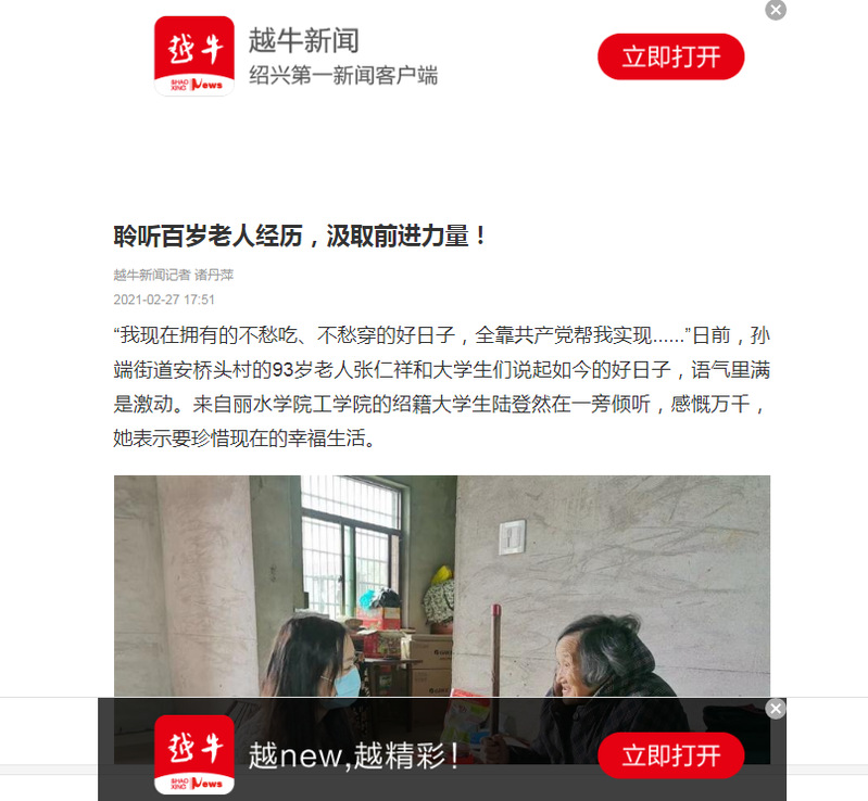 2月27日,绍兴第一新闻客户端越牛新闻报道了我校工学院“聆听百岁老人经历,汲取前进力量”寒假社会实践活动的消息。