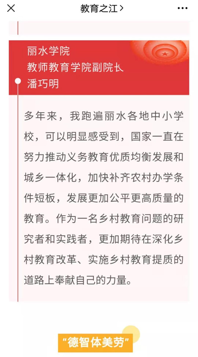 2021年3月9日,教育厅微信公众号教育之江发布推文:两会教育“关键词”,浙江师生有话说!我校教师教育学院副院长潘巧明接受采访。