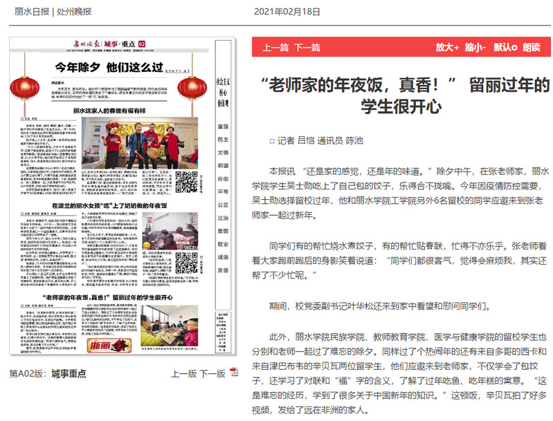 2021年2月18日,处州晚报报道了我校留校学生在教师家中共享年夜饭的消息。