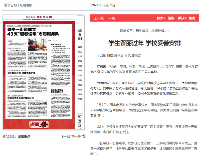 2021年02月09日,处州晚报报道了我校妥善安排留丽过年学生的消息。