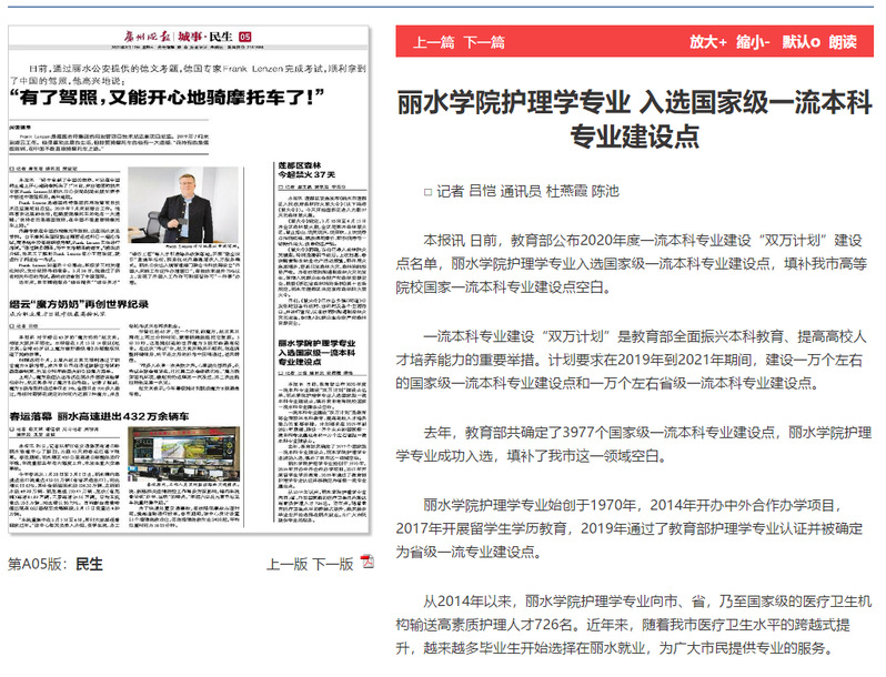 2021年03月10日,处州晚报报道了我校护理学专业入选国家级一流本科专业建设点的消息。