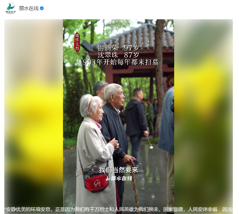 丽水在线:丽水一对九旬老夫妇冒雨来到万象山革命烈士陵园祭扫