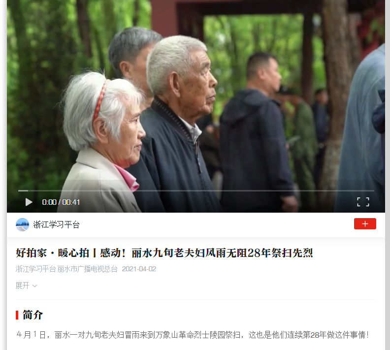 2021年4月2日,学习强国浙江学习平台报道了我校离休干部雷新荣与夫人参加丽水市新四军研究会组织的万象山革命烈士陵园祭扫的消息。