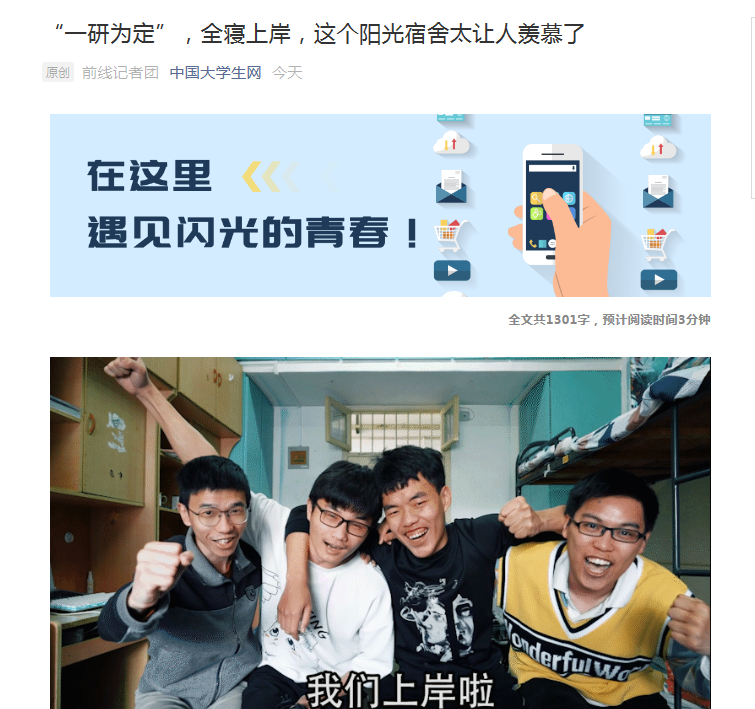 2021年5月26日,中国大学生网发布了我校工学院学霸寝室“‘一研为定’,全寝上岸,这个阳光宿舍太让人羡慕了”的相关消息。