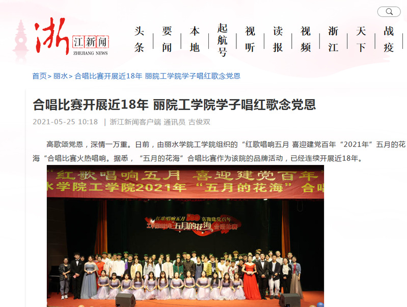 5月25日,浙江新闻报道了我校工学院“合唱比赛开展近18年 丽院工学院学子唱红歌念党恩”的消息。