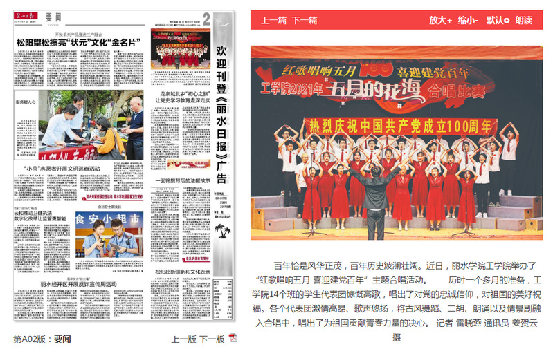 5月31日,丽水日报刊发了我校工学院举办“红歌唱响五月 喜迎建党百年”主题合唱活动的消息。