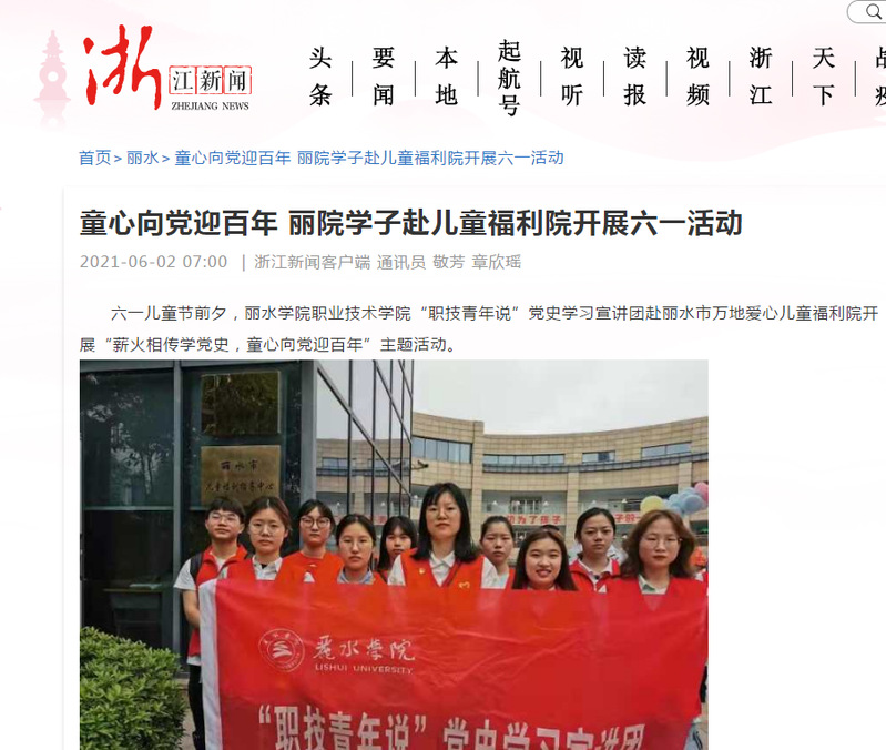 6月2日,浙江新闻刊发了我校职业技术学院学生前往万地儿童福利院开展六一活动的消息。