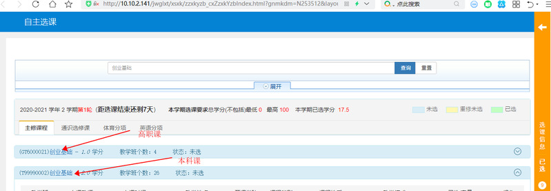 2.5通识选修课、大学体育课、大学外语分别在通识选修课、体育分项、英语分项中选课;《中国近现代史纲要》、《马克思主义基本原理》、《毛泽东思想与中国特色社会主义理论体系概论》、《创业基础》课程可以按课程名称查询后进行选课,但要注意区分本科与高职的课程,课程代码以T开头的是本科课程。《毛泽东思想和中国特色社会主义理论体系概论》与《马克思主义基本原理概论》每位学生只能选其中一门。