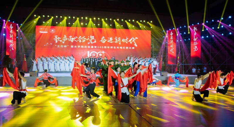6月9日晚,我校在体育馆举行了隆重的“歌声献给党 奋进新时代”庆祝建党100周年师生共唱红歌比赛,2000余名师生同台表演,用歌声唱出党史,用朗诵述说党史,用舞蹈展现党史。党史学习教育市委第六巡回指导组副组长、市教育局党委副书记叶伟勇,工行丽水市分行行长王琳、副行长林青等,我校党政班子成员,老领导,全体中层干部以及广大师生观看了比赛。