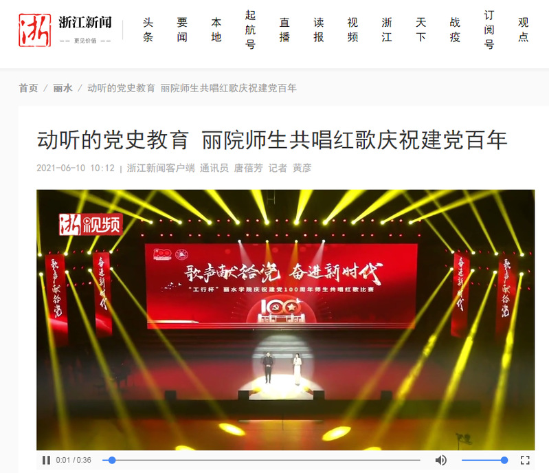 6月10日,浙江新闻刊发了我校开展“歌声献给党 奋进新时代”庆祝建党100周年师生共唱红歌比赛的消息。