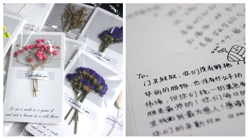 “感谢四年的旅途中你们的默默陪伴,照亮我生活的方方面面,谢谢你们”活动过后,毕业生纷纷表示,这次活动很有意义,在与母校临别之际,能借此机会向相处了四年的老师、门卫和身边人表达心底的感谢与祝福,为这段青春画上圆满句号。