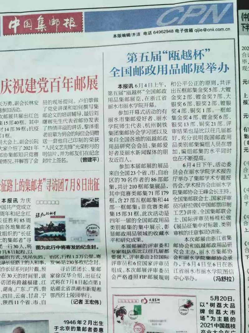 6月8日,中国集邮报总第2544期在二版综合新闻刊发了第五届“瓯越杯”全国邮政用品邮展在我校举办的消息: