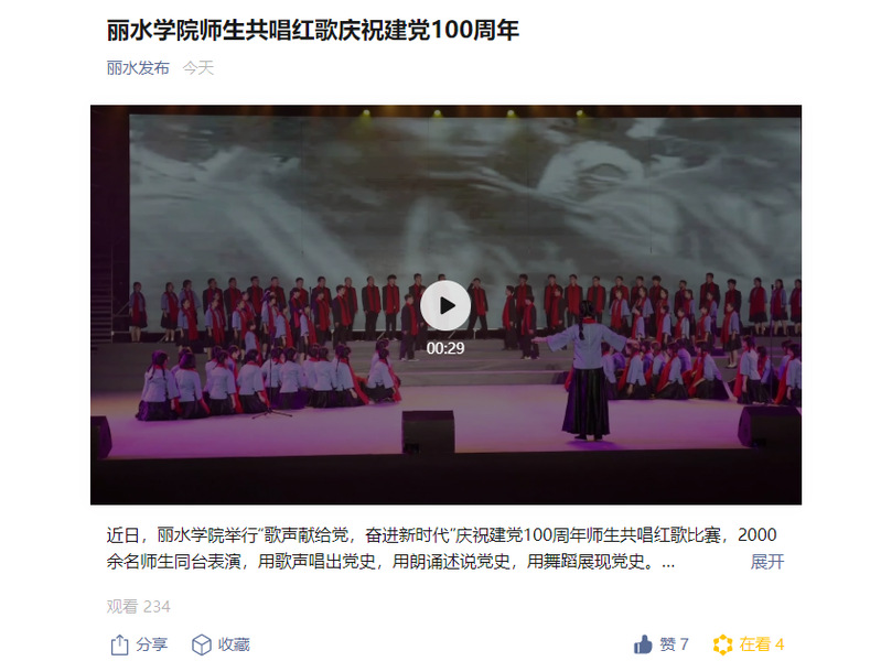 6月17日,丽水市政府官方微信丽水发布报道了我校师生共唱红歌庆祝建党100周年的消息。