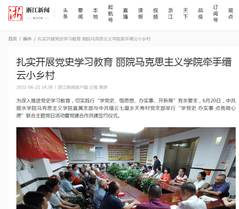 6月21日浙江新闻报道了我校马克思主义学院直属支部与中共缙云七里乡天寿村党支部举行“学党史 办实事 点亮微心愿”联合主题党日活动暨党建合作共建签约仪式的消息。