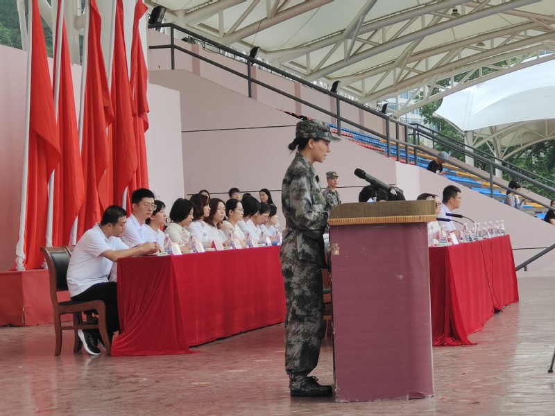 教官代表、我校军魂社成员干晓方代表全体教官作出承诺:以良好的军人形象、过硬的军事本领带好队伍。