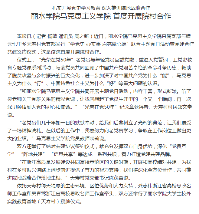 7月8日,指尖丽水刊发了我校马克思主义学院直属支部与缙云七里乡天寿村党支部开启院村合作的消息。