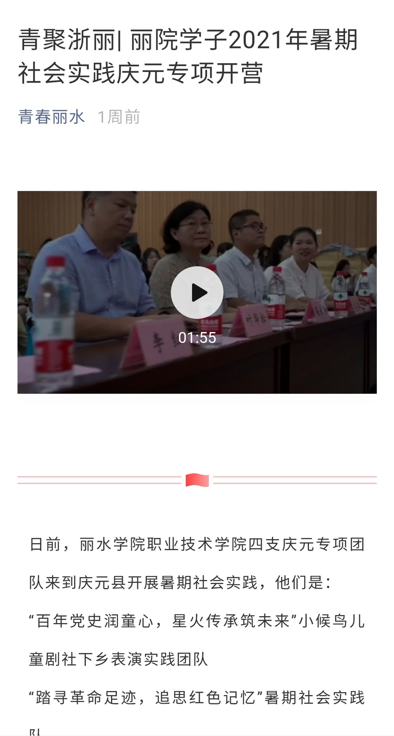7月16日,丽水团市委官方微信号“青春丽水”报道了我校职业技术学院“青春庆元行”2021年暑期社会实践开营的消息。