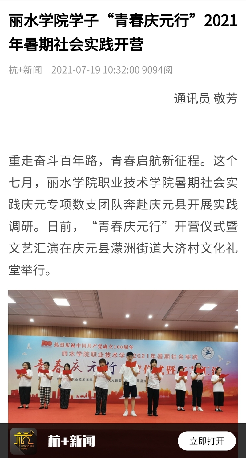 7月19日,杭州日报新闻客户端“杭+新闻”报道了我校职业技术学院“青春庆元行”2021年暑期社会实践开营的消息。