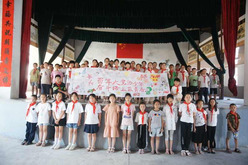 为引领青少年铭记党史,团队开展“童心向党,喜迎百年”系列主题课程,包括红色小诗创作课、“我眼中的党”绘画课、主题演讲和非遗传承手工课等。超过一百二十名留守儿童用原创诗歌追忆百年党史,以文字传达爱党爱国之情。文艺是时代前进的号角,队员开展“百人共跳,共颂党恩”特色舞蹈课程,从舞蹈基本功入手,教导孩子们舞蹈《红星闪闪》。